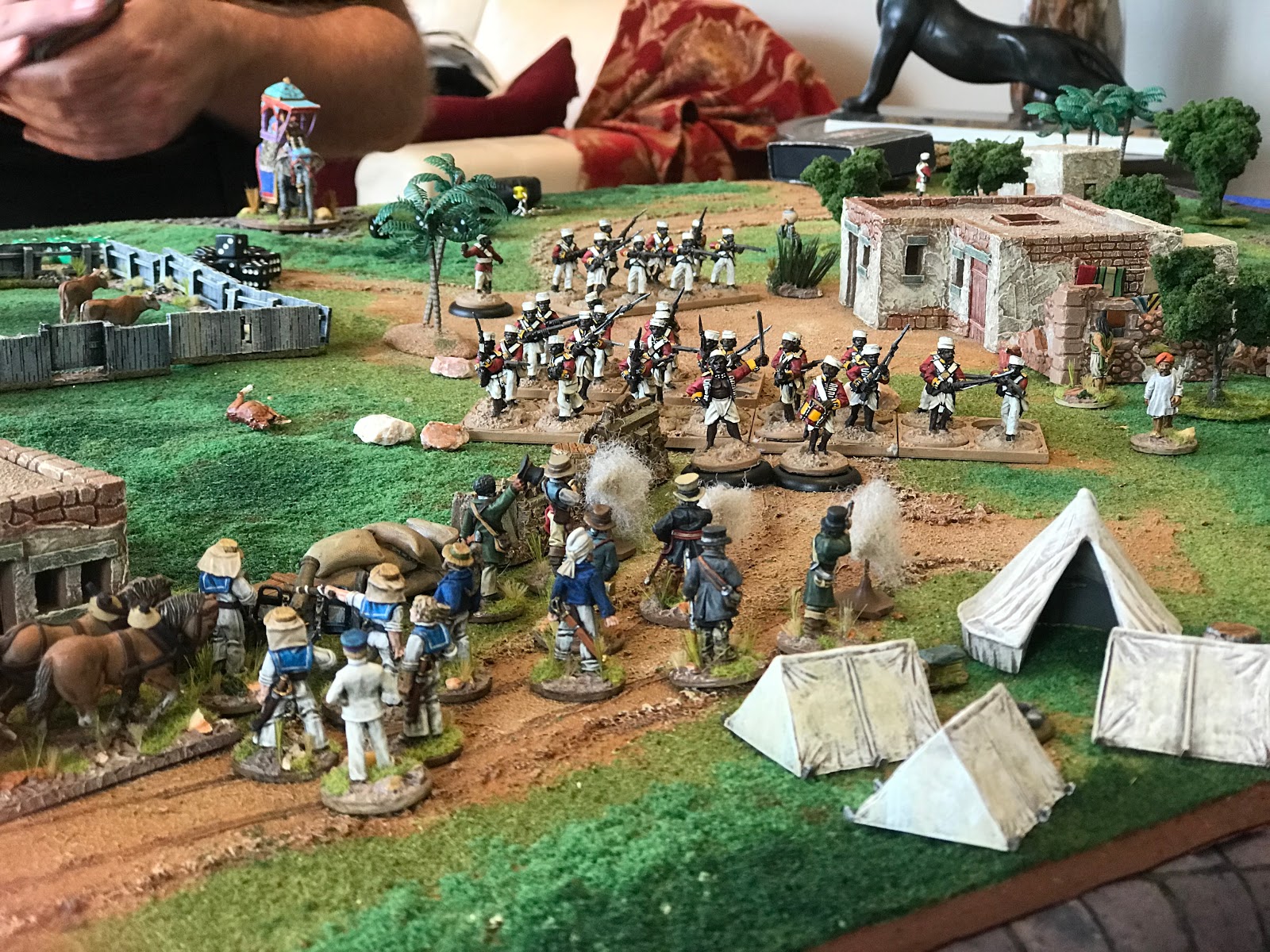 The 9th regiment step-out around the house, deploy toface some sepoy rabble who get in their way. There are enough command cards in the next line to do a "thin red line" on them. It was over so quickly there wasn't time to take a photograph.